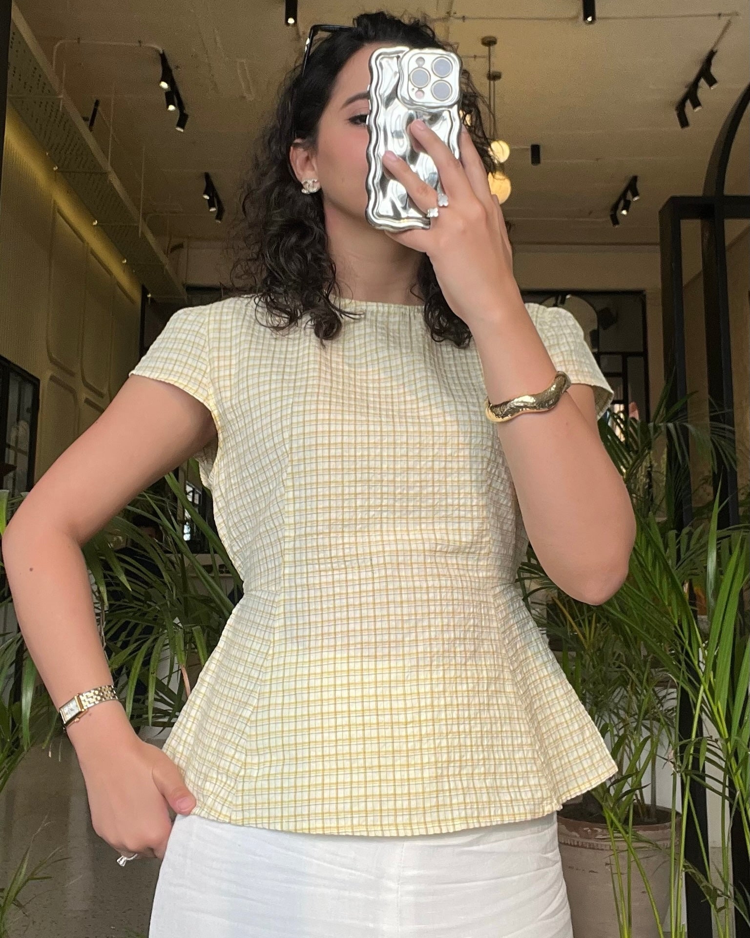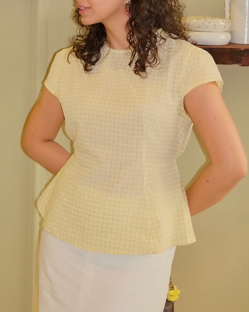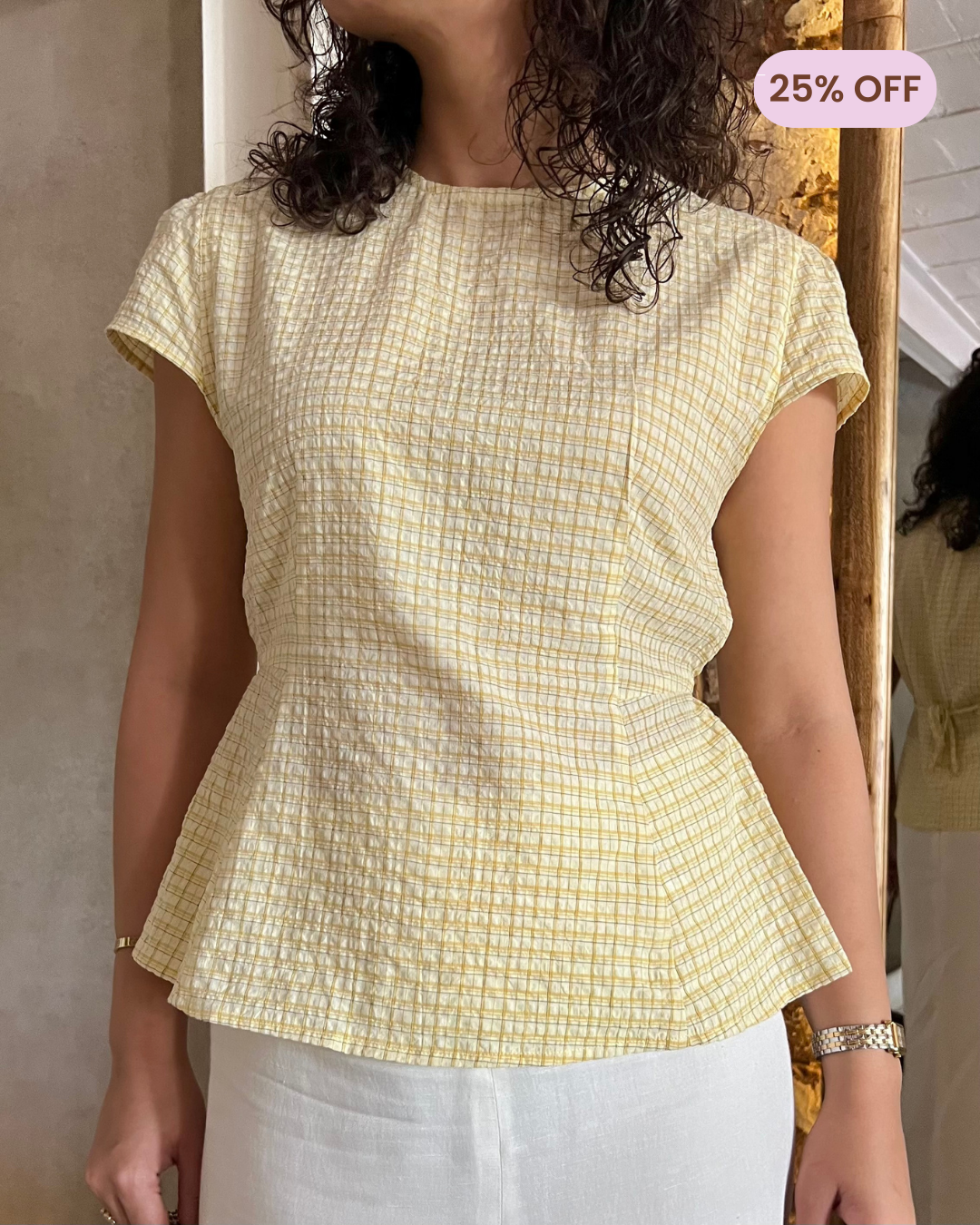 Made from airy crinkled cotton in a soft pastel yellow check, the Buttercup Top is designed with a clean round neckline, delicate cap sleeves, and a hidden tie at the back to gently cinch the waist—letting you shape the fit to your liking. This adjustable detail makes it an easy one-size style that comfortably flatters Small to Medium frames.